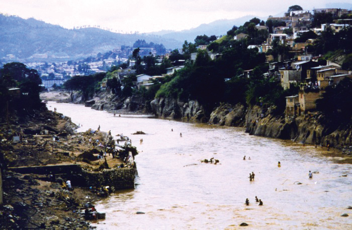 Tegucigalpa, Honduras, in the aftermath of Hurricane Mitch. More than 9,000 deaths and 9,000 missing were attributed to Mitch, making it the second-deadliest hurricane in history.