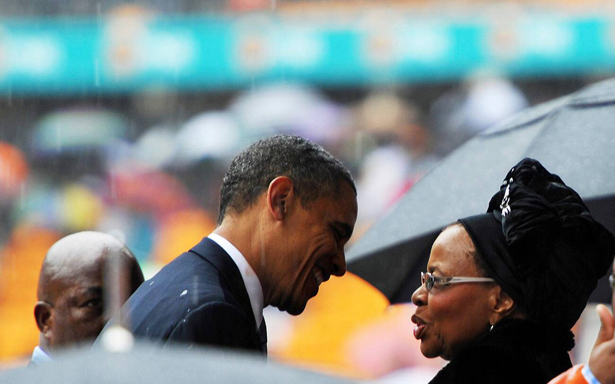 U.S. President Barack Obama with Nelson Mandela’s widow, Graca Machel, at Mandela’s memorial service shortly after his death, in Johannesburg, South Africa.