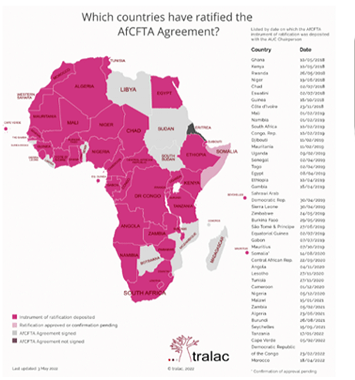 This ambitious project, which entered into force in May 2019, is in its first phase of implementation, with negotiations underway to set the terms for trade in goods and services, and second-phase talks also in progress to address investment, intellectual property rights and competition policy, among other things. The third phase will include the digital economy and a special protocol on women and youth. As of the Tralac Law Centre’s May 2022 status update, no trade had yet taken place under the AfCFTA regime, but there is significant interest in supporting its successful implementation. [See above for a map and list of African countries that have ratified the AfCFTA agreement.]