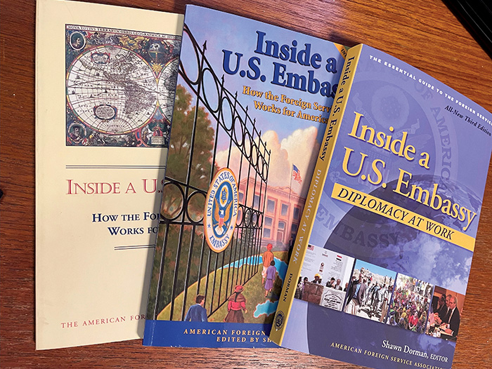 Twenty-six years ago, just 5,000 copies of the first edition of Inside a U.S. Embassy were printed. The second edition far surpassed that figure, with “tens of thousands” of books sold, according to the book’s editor, Shawn Dorman, who is now editor in chief of The Foreign Service Journal and AFSA publications director. “The State Department ordered 10,000 books initially, and every time we reprinted, they bought thousands more,” she says. “They gave a copy to every person who passed the written test—21,000 people used to take the test each year, so that added up.” In addition, military entities purchased copies by the hundreds.