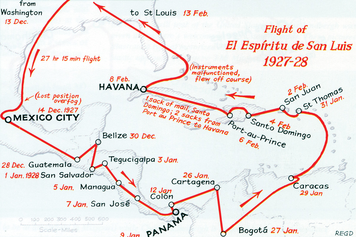 Rested and refreshed, Lindbergh lifted off from the isthmus on Jan. 26, 1928, and headed 400 miles east-northeast across the Caribbean Sea to Cartagena, his first destination in South America.