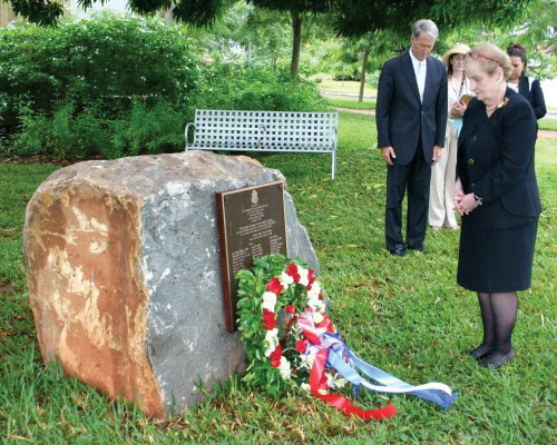 In 2000 Secretary Albright came to Moscow, where my husband was serving. After her meetings with Vladimir Putin, where she wore her famous “Three Monkeys” pins, she and Ambassador James Collins dedicated the new embassy building and met with staff and families.