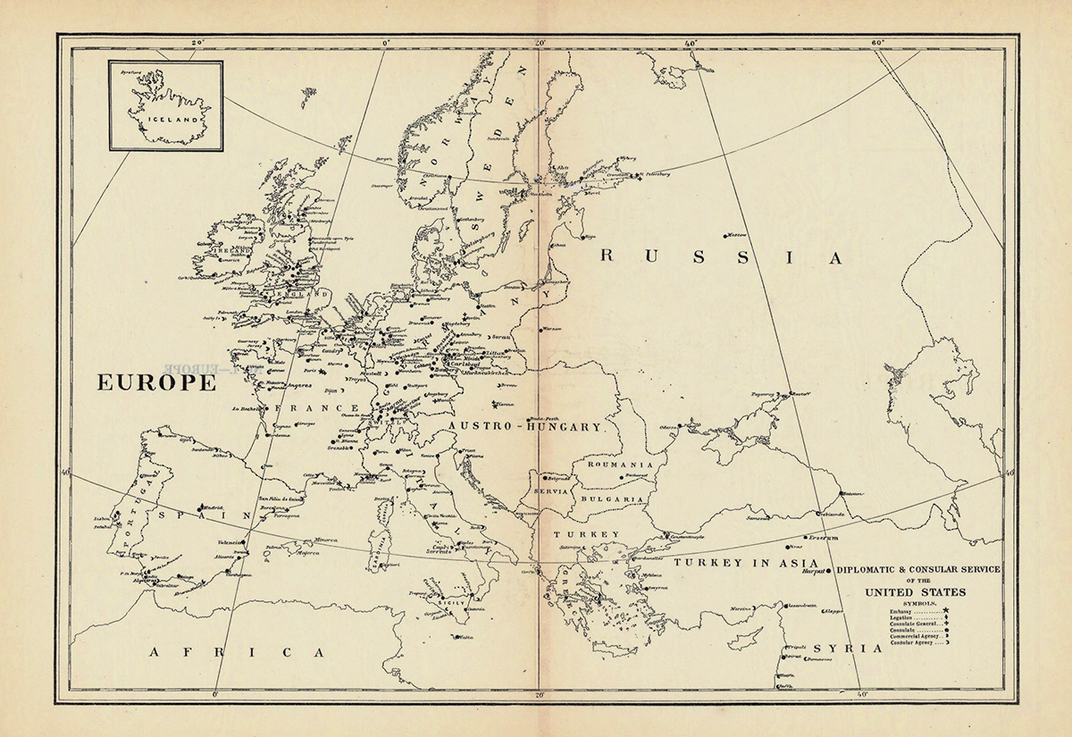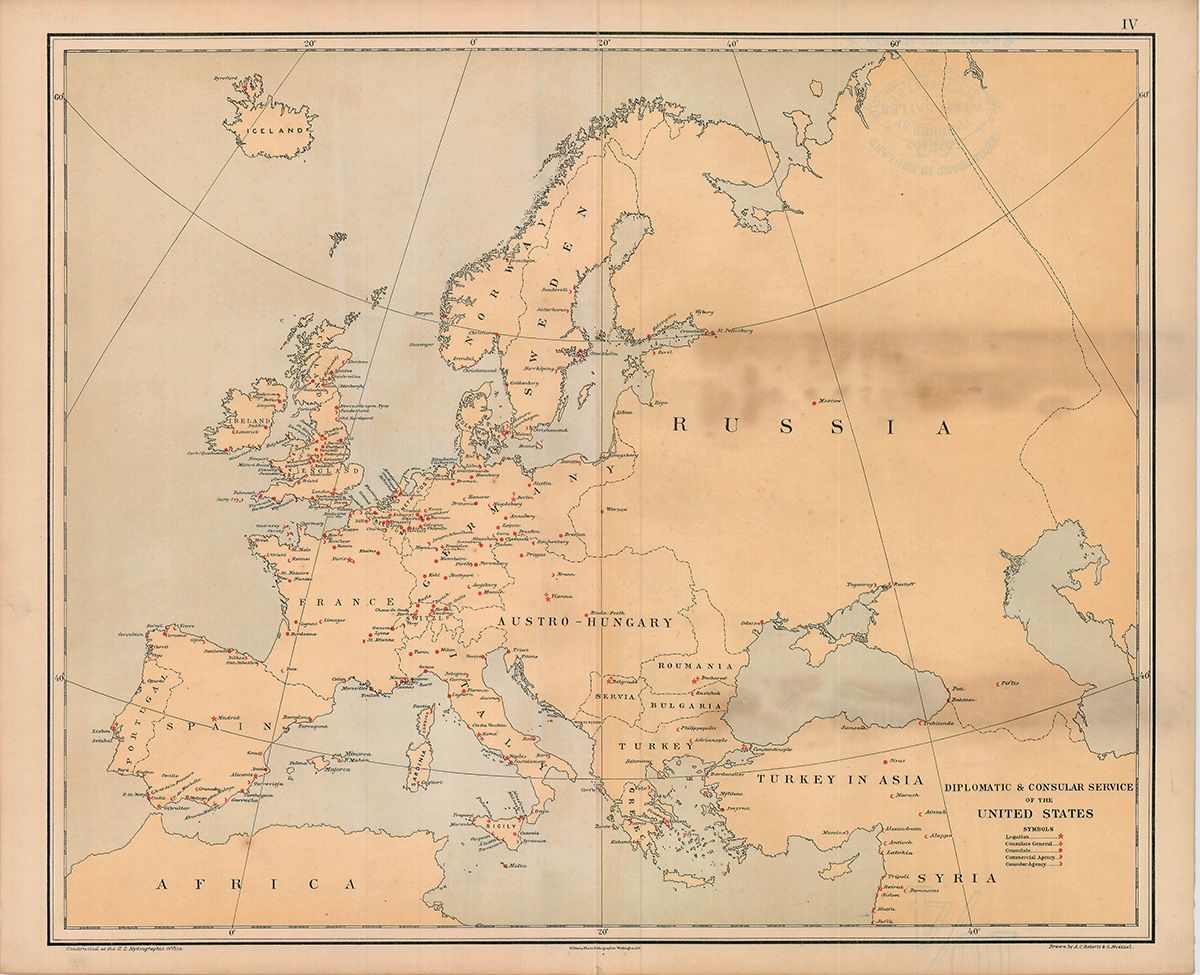 The State Department’s Ralph Bunche Library map collection, especially the series “Diplomatic and Consular Offices” (later “Foreign Service Posts”), shows the evolution between 1888, when U.S. legations were the norm, to 1903, when entries for “embassies” take the lead in the map key. (See maps below.) Writes the Office of the Historian: “The United States only sent and received Ministers prior to 1893. Until 1893, the United States was not considered a major power, therefore the highest-ranking diplomatic representatives that it sent or received were Ministers of one sort or another.”