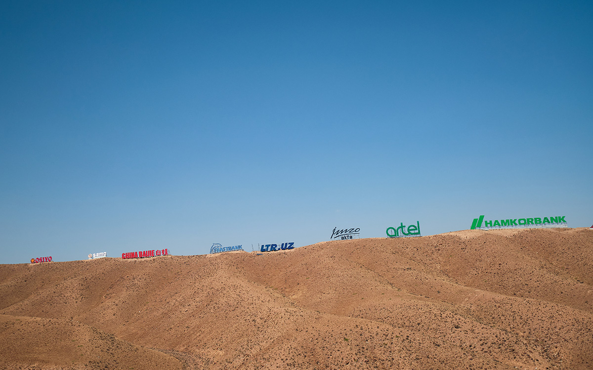 The Fergana Valley is about 250 kilometers southeast of the capital, Tashkent, and is the economic engine and most densely populated area of Uzbekistan. The journey to the valley is a four-hour drive through a pass in the Kuraminskiy Khrebet mountain range. Once in the desolate, mostly bare mountains, the view is unadulterated nature—except at a certain section. Though billboards are banned there, this giant “Hollywood” signage is okay.
