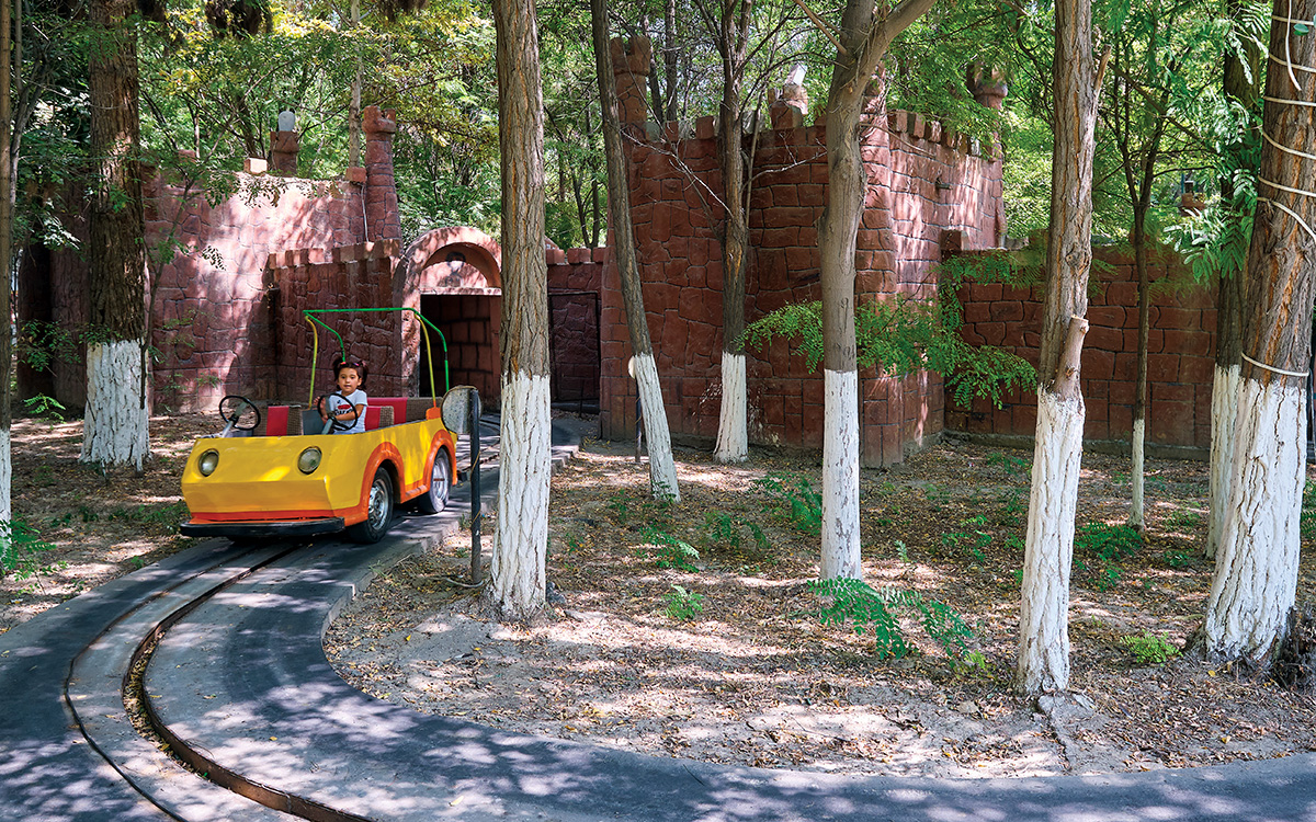 Uzbekistan is a young country, full of kids. Every green space seems to feature an amusement park. The Silk Road fantasy comes alive in this car-ride attraction. The tree trunks are painted white for insect control.