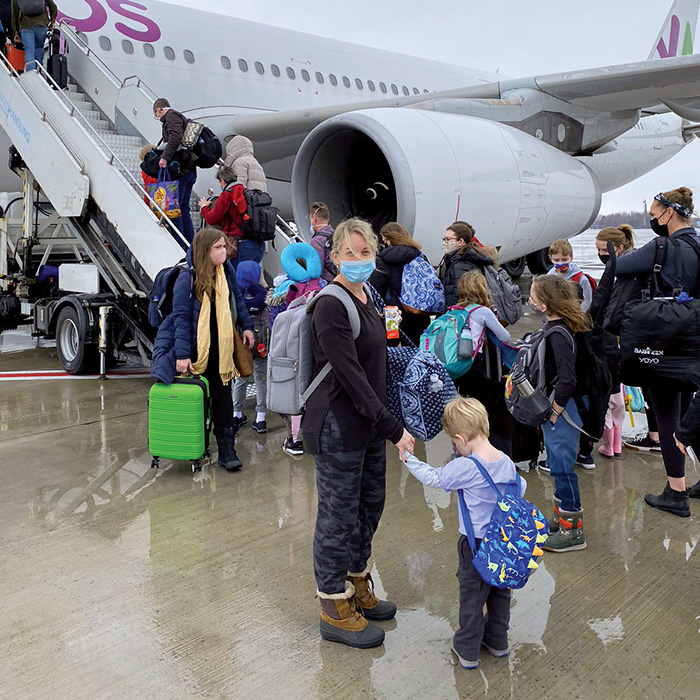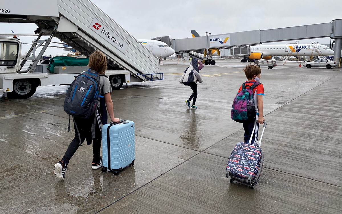 My husband is standing in the departures lounge at Kyiv International Airport. The day is Jan. 29, 2022. Our three children are standing close to him. They are all wearing masks that obscure their beautiful faces. We’ve just battled long check-in lines with frazzled airport staff who are struggling to keep up with the frantic pace and demands as too many people try to leave Kyiv on too few flights. In several weeks, this airport will be empty, the sky closed to commercial flights. But right now, it’s a mélange of sweat and panic and exhaustion. And it is also where we are saying goodbye to my husband, who will stay behind.