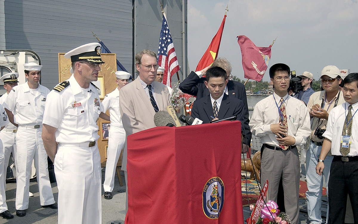 Defense Minister Phạm Văn Trà met Secretary of Defense Donald Rumsfeld at the Pentagon in early November 2003. Later that month the USS Vandegrift sailed up the Saigon River waving the Stars and Stripes next to the Vietnamese flag and docked at the Port of Saigon. Susan and I were on board, chatting with young sailors whose fathers had fought in the war. The ship visit was a profound signal of good relations—to Vietnam’s own people, to the U.S., and to Beijing. Vietnam had invited back an American warship, an iconic symbol of the military power of its former enemy.