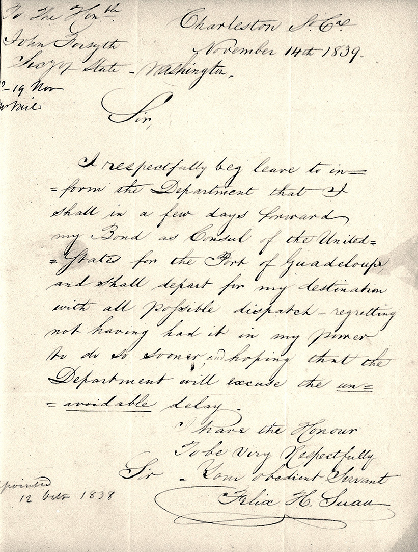 In a letter to U.S. Secretary of State John Forsyth, dated February 13, 1840, Suau’s former employer in Charleston wrote that Suau had always conducted himself as “a strictly moral and honest young man.” The correspondence of the second U.S. consul in Pointe-à-Pitre with the department reveals that he was a diligent civil servant.