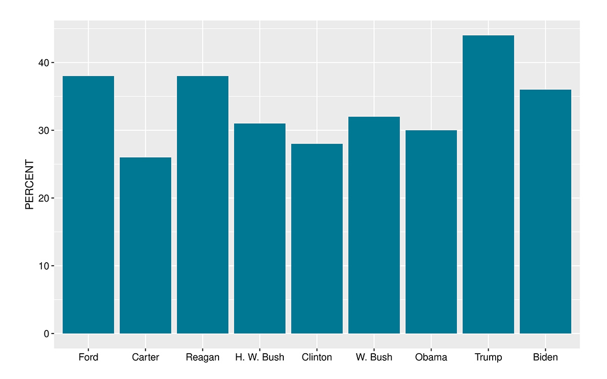 Data collected by scholar Matt Malis for the period from 1960 to 2015 shows no evidence that the trend of empowering political appointees over career members of the Foreign Service has significantly abated in recent years (see figure above). If anything, it may be on the rise. Data from the American Foreign Service Association suggests the Trump and Biden administrations have had the highest ratios of political appointees since Reagan (see figure below).