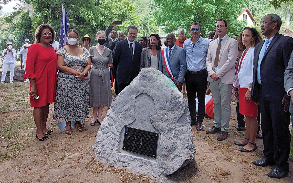 The new memorial, created by the Martinican artist Hervé Beuze with volcanic rock, was placed in an area intended to become a memorial for the consular corps in the beautiful Louis Ernoult Garden behind the cathedral. It was inaugurated on May 8, 2022, the 120th anniversary of the 1902 catastrophe, as part of annual monthlong celebrations, “May of St. Pierre.” Mayor of St. Pierre Christian Rapha presided over the French-American commemorative ceremony, which featured U.S. Consul to Barbados and the Eastern Caribbean (also accredited to Martinique) Ms. Jessica A. Hartzfeld, who read a letter from U.S. Ambassador to France Ms. Denise Campbell Bauer.