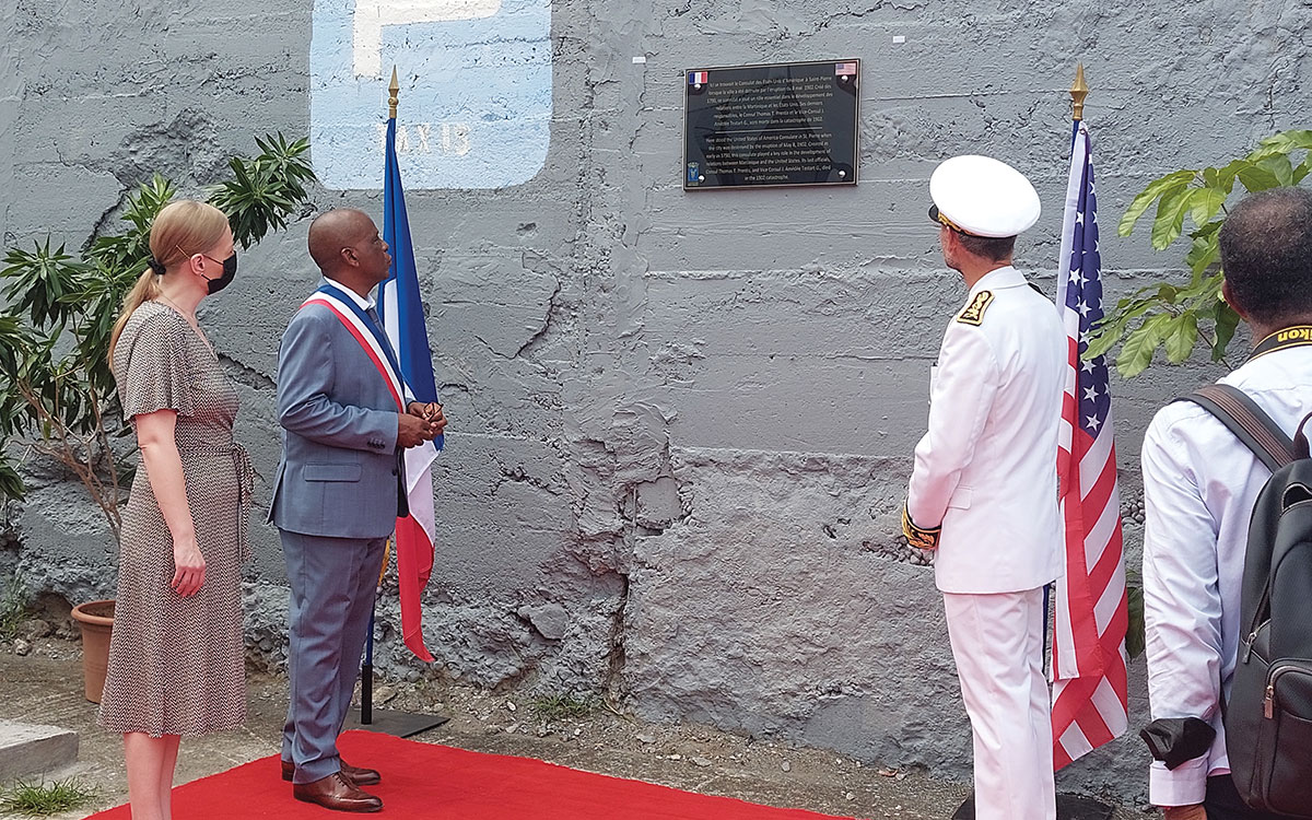On May 8 another memorial plaque was unveiled, this one at the location of the former United States consulate in St. Pierre, next to Place Bertin, the square on the seafront. Founded as early as 1790 by George Washington, this consulate represents the privileged relations built up by the United States and France since the American Revolutionary War. It played a critical role in the development of exchanges between the United States and Martinique and contributed significantly to the international prestige of St. Pierre. Some consuls expressed a great attachment to Martinique, including William A. Garesché, who served from 1886 to 1891, and wrote: “The island itself was a dream of Paradise.”