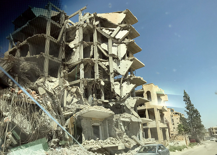 In a line of armored jeeps accompanying a few visiting senior U.S. officials and escorted by both U.S. Special Forces and elements of our SDF counter-ISIS partners, we entered the city from the northwest. It was a cloudy, cold morning, with a bit of fog drifting through the streets. I had never seen anything like it—blocks and blocks where every single building had been hit. It reminded me of World War II photographs of the destruction of Dresden. Roofs were knocked off, some hanging like a lean-to down to the ground, against floors pancaked into crashing vectors of destruction. Slabs of concrete jutted out at wrong angles, like fractured limbs broken beyond what any cast would ever repair. More concrete hung from blasted ceilings, dangling in a mesh of wrinkled steel rebar like large insects caught in some horrific, oversized spider web.