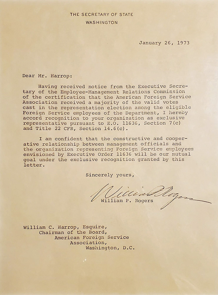 State ballots were counted on Dec. 4, 1972. AFSA was the overwhelming victor with a 75 percent majority. At USIA, certification of our strong victory was delayed by AFGE’s final, futile, protests. At USAID, management in extreme denial refused to hold elections. That silliness was overcome, elections were held, and AFSA won 80 percent of the vote. By the end of March 1973, AFSA Chairman Bill Harrop had received certification letters from the Secretary and the heads of the other foreign affairs agencies. AFSA now had the power and responsibility to negotiate personnel policies in the foreign affairs agencies and to defend and speak for their employees.